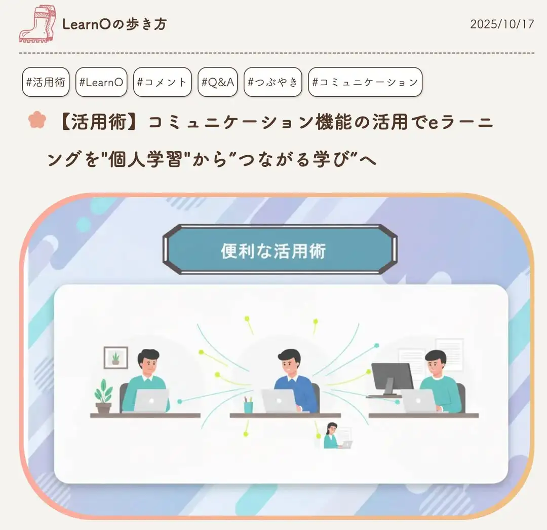 LearnOの「コミュニケーション機能」を使えば、受講者同士や管理者とLearnO上で交流することができます。