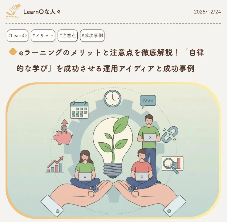 「LearnO」の活用事例を通じて、eラーニングを「やらされる学び」から「自律的な学び」へと変える成功のヒントが満載です。